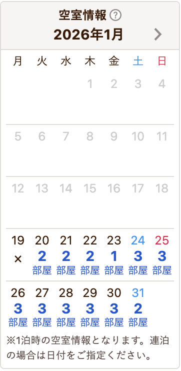 空室は日によって変動しますので、カレンダーをご確認のうえお早めにどうぞ。